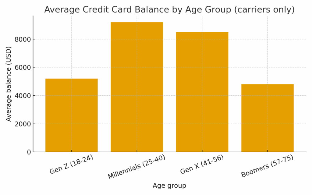 Millennials (ages 25–40 in 2025) generally carry the highest credit card balances, averaging around $8,200 per cardholder. Gen X (41–56) follows closely with averages near $7,500.